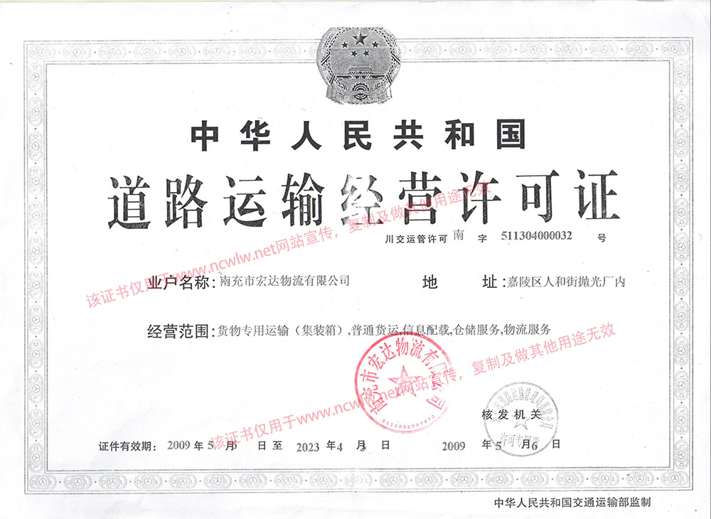 南充物流網(wǎng)(www.szqingsonghu.com) 南充市宏達物流有限公司道路運輸經(jīng)營許可證